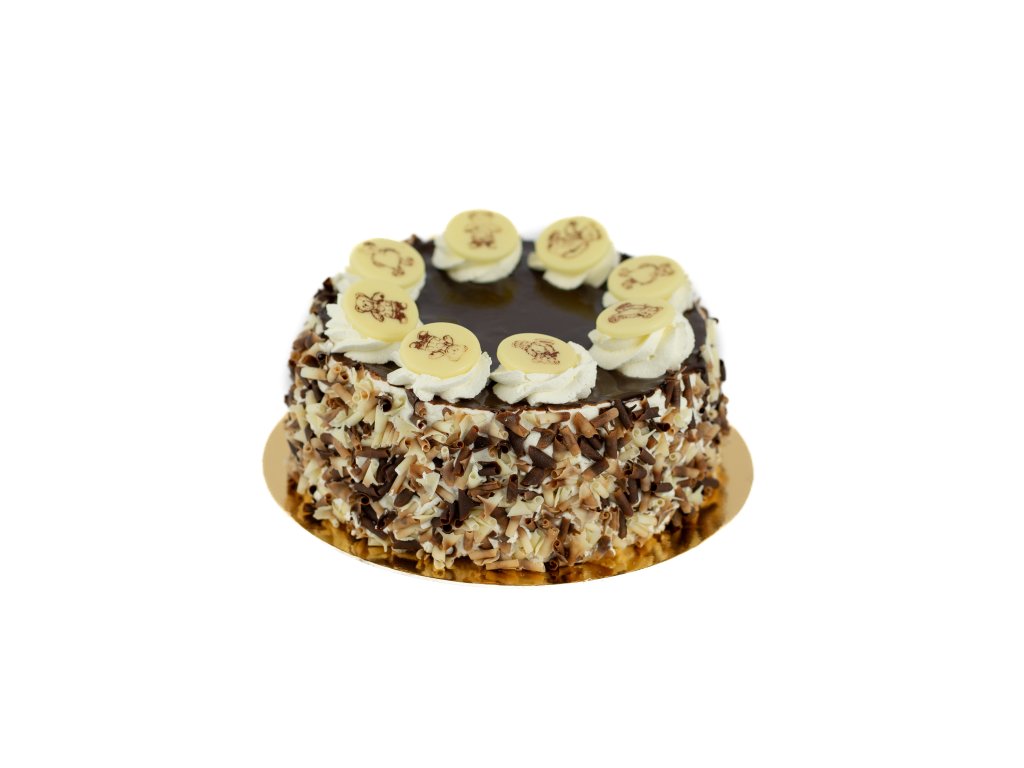 Složení: náplň [SMETANA, krém (voda, plně ztužené rostlinné oleje a tuky (palmojádrový, slunečnicový), cukr, stabilizátory (E420ii, E463), MLÉČNÉ bílkoviny, emulgátory (E472e, slunečnicový lecitin E322), sůl, aromata, barvivo E160a), voda, směs (cukr, zahušťovadlo (modifikovaný škrob, E401, E516, E450(iii)), želatina, aroma, mořská sůl), směs (dextróza, sušený TVAROH, sušená SYROVÁTKA, regulátor kyselosti kyselina citrónová, LAKTÓZA, sušené MLÉKO, aroma, MLÉČNÝ protein)], korpus světlý [PŠENIČNÁ mouka, cukr, emulgátory E472b, E477, glukosový sirup, MLÉKO sušené, škrob PŠENIČNÝ, kypřící látky (E450i, E500ii), sůl jedlá jodidovaná (sůl jedlá, jodičnan draselný), barvivo E160a(i), zahušťovadlo E415, aroma, pasterovaná VAJEČNÁ melanž, voda, PŠENIČNÁ mouka], korpus tmavý [(PŠENIČNÁ mouka, cukr, škrob kukuřičný, emulgátory (emulgátory E472b, E477), glukózový sirup, sušené MLÉKO odtučněné), kakaový prášek se sníženým obsahem tuku, kypřící látky (E450i, E500ii), sůl jedlá jodidovaná (sůl jedlá, jodičnan draselný), zahušťovadlo E415, barvivo E160a(i), aroma), pasterovaná VAJEČNÁ melanž, voda, PŠENIČNÁ mouka], poleva [čokoláda v prášku 40% (cukr, kakao), glukózo-fruktózový sirup, voda, cukr, modifikovaný škrob, regulátor kyselosti E334, želírující látka E440, konzervant E202, aroma], hobliny (cukr, kakaové máslo, kakaová hmota, sušené MLÉKO, sušená SYROVÁTKA, LAKTÓZA, emulgátor E322, přírodní vanilkové aroma), dekor (cukr, kakaové máslo, sušené MLÉKO, přírodní vanilkové aroma), potisk (kakaové máslo, cukr, barvivo E172, kakaový prášek se sníženým obsahem tuku).