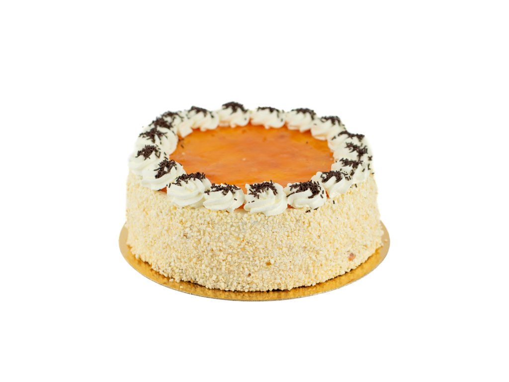 Korpus (piškot tmavý (pšeničná mouka, cukr, emulgátor (emulgátory E472b, E477, glukosový sirup, sušené mléko odtučněné), kakaový prášek se sníženým obsahem tuku, pšeničný škrob, kypřící látky E450i, E500ii, sůl jedlá s jódem (sůl, jodičnan draselný), zahušťovadlo E415, barvivo E160a(i), aroma), pasterovaná vaječná melanž, voda, slunečnicový olej), náplň (rostlinný krém (voda, plně ztužené rostlinné tuky (palmojádrový) a oleje (slunečnicový), cukr, stabilizátory E420ii, E463, mléčné bílkoviny, emulgátory E472e, E322-slunečnicový lecitin, sůl, aroma, barvivo E160a), ovocná náplň 19 % (meruňky sušené (SO2) 31%, meruňky kusové 25%, cukr, voda, modifikovaný škrob E1442, kyselina citronová E330, zahušťovadlo E418, konzervant E202, aroma), voda, směs (cukr, zahušťovadlo (modifikovaný škrob, E401, E516, E450(ii)), želatina, sušený jogurt 7%, kyselina citronová E330, aroma, mořská sůl), ozdoba (smetana, rostlinný krém (voda, plně ztužené rostlinné tuky (palmojádrový) a oleje (slunečnicový), cukr, stabilizátory E420ii, E463, mléčné bílkoviny, emulgátory E472e, E322-slunečnicový lecitin, sůl, aroma, barvivo E160a), cukr), posyp (cukr, pufovaná rýže), želírující směs (cukr, voda, glukózový sirup (SO2), želírovací látka E440, kyselina E330, regulátor kyselosti E331, E509, odpěňovač E900, přírodní aroma s meruňkovou příchutí), posyp (cukr, částečně ztužený palmojádrový a kokový tuk, kakaový prášek se sníženým obsahem tuku 16%, emulgátor E322 sójový lecitin, aromata)